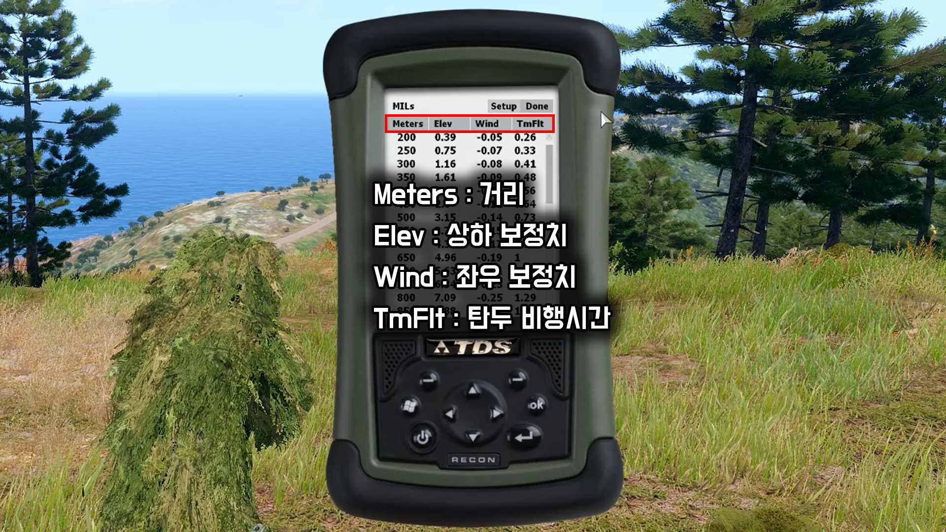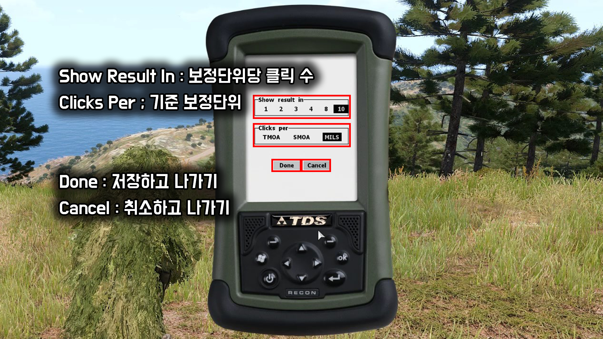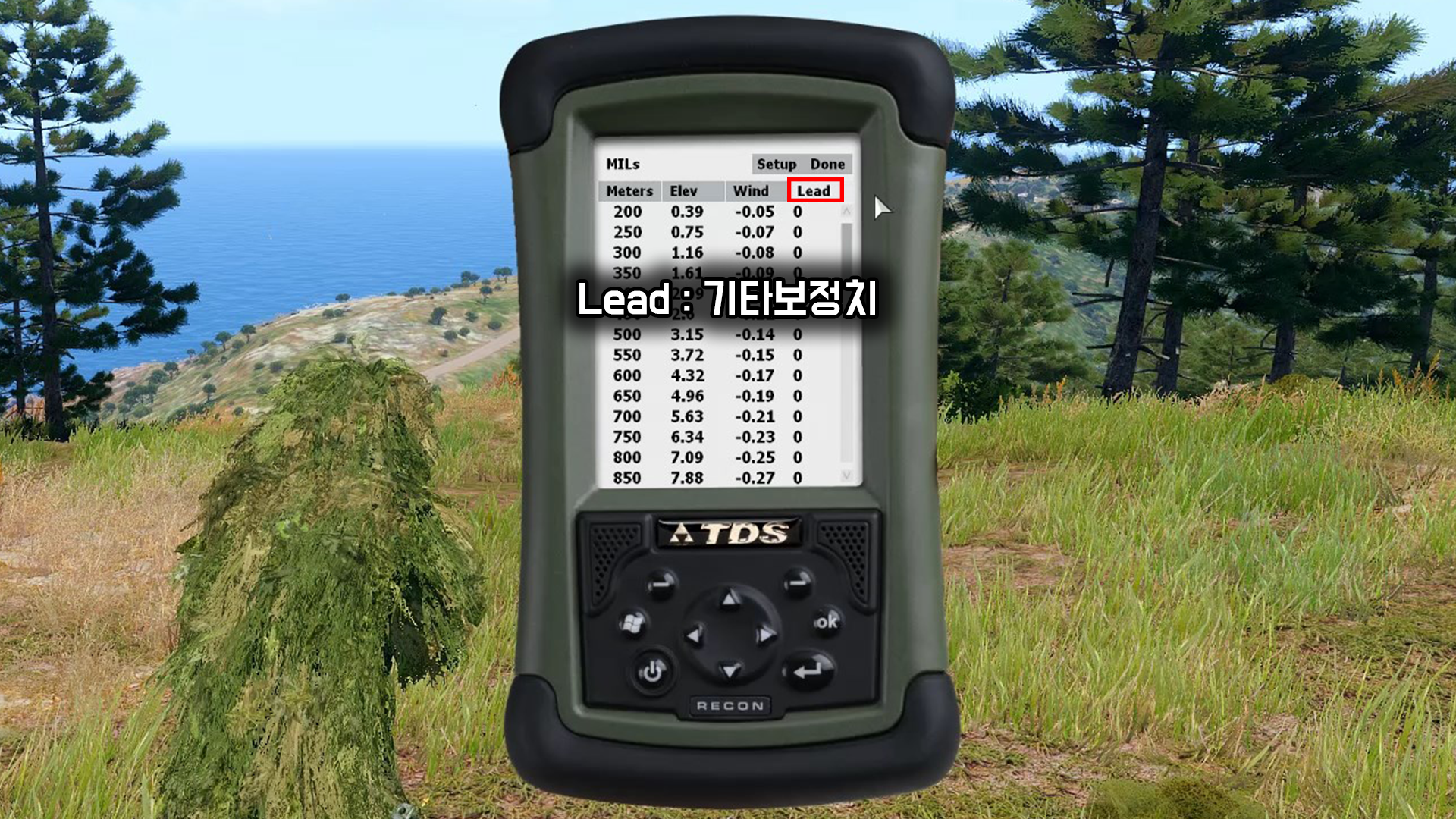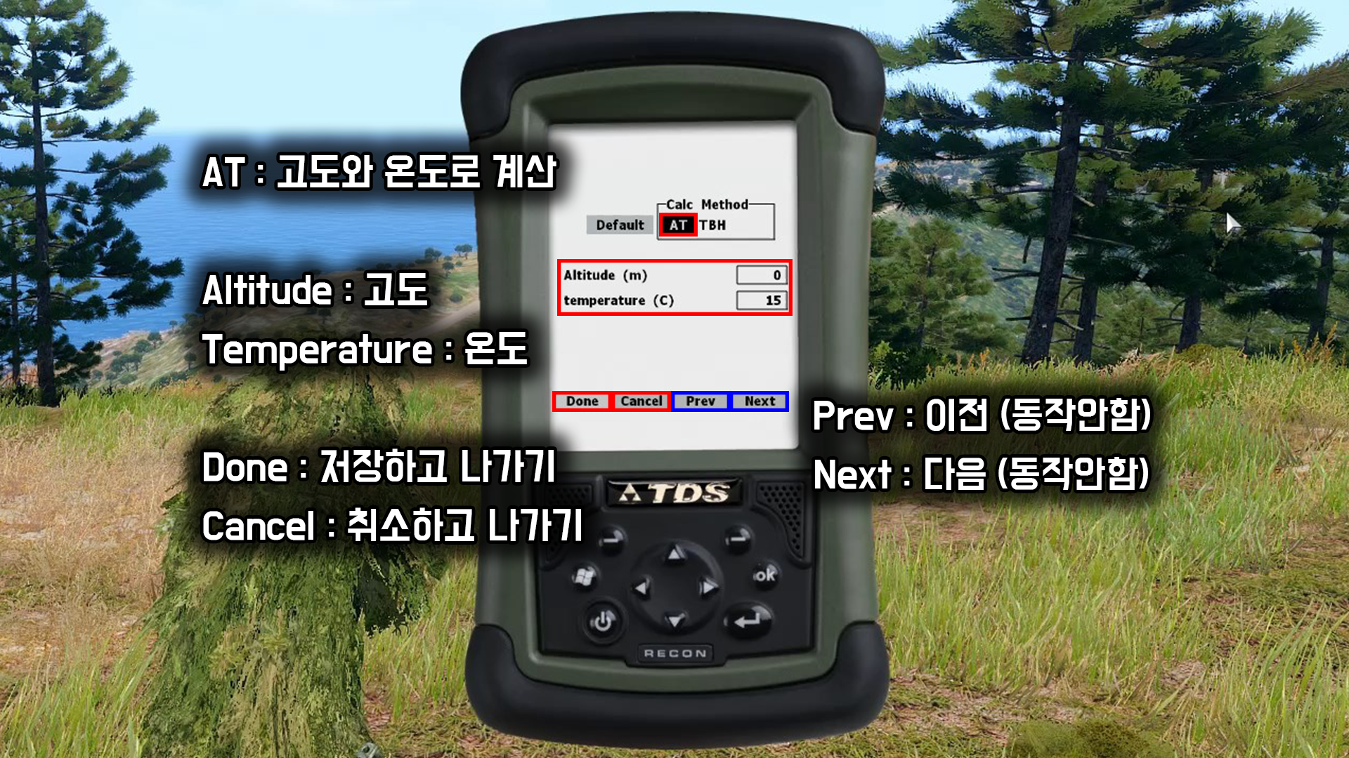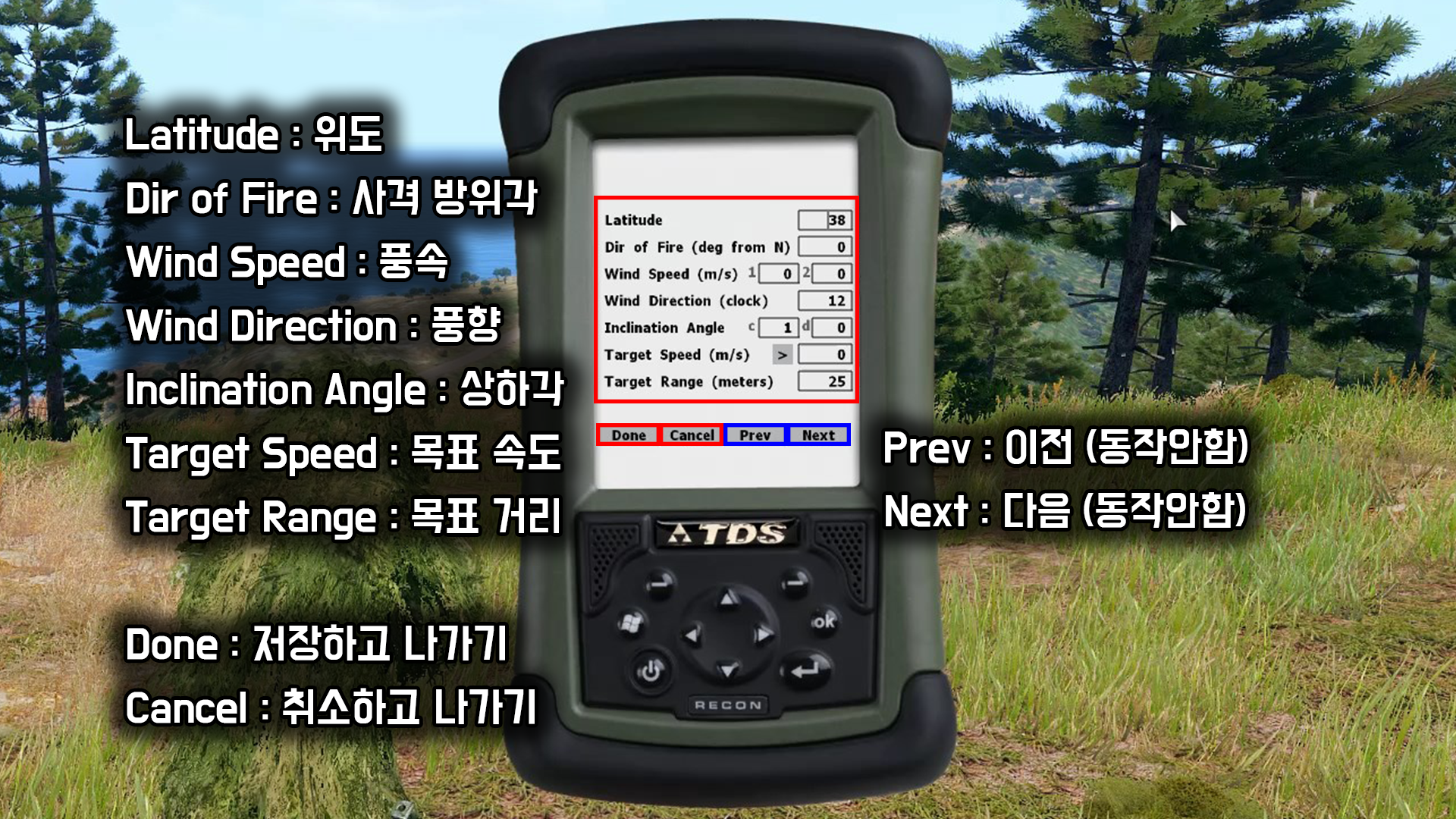 Latitude는 위도를 의미합니다. 위도에 따라 탄두에 미치는 코리올리 효과가 달라집니다. Dir of Fire는 사격 방위각을 의미합니다. 정 북쪽을 기준으로 몇도인지 입력합니다. Wind Speed와 Wind Direction은 각각 풍속과 풍향을 의미합니다. 바람에 의한 클리크 좌우보정치에 영향을 줍니다. 풍속의 1번과 2번은 각각 풍속 최솟값과 풍속 최댓값을 의미합니다. 풍향은 보고있는 방향을 12시로 하여 바람이 불어오는 방향을 시계 방향으로 기입합니다. Inclination Angle은 상하각을 의미합니다. 보고있는 수평선을 기준으로 목표물과의 상하 각도를 의미합니다. c와 d값은 각각 COS (코사인)값과 Degree (도)을 의미하며 둘 중 하나의 값만 입력하면 나머지 값은 자동으로 변환되어 입력됩니다. Target Speed는 목표물의 이동속도로써 가운도 꺽쇠 모양을 눌러 > (우측으로 이동), < (좌측으로 이동) 이동방향을 설정할 수 있습니다. Target Range는 목표물과의 직선거리를 의미합니다. Done을 누르면 입력한 데이터를 저장하고 나갑니다. Cancel을 누르면 입력한 데이터를 저장하지 않고 나갑니다. Prev와 Next는 동작하지 않는 것으로 보입니다.