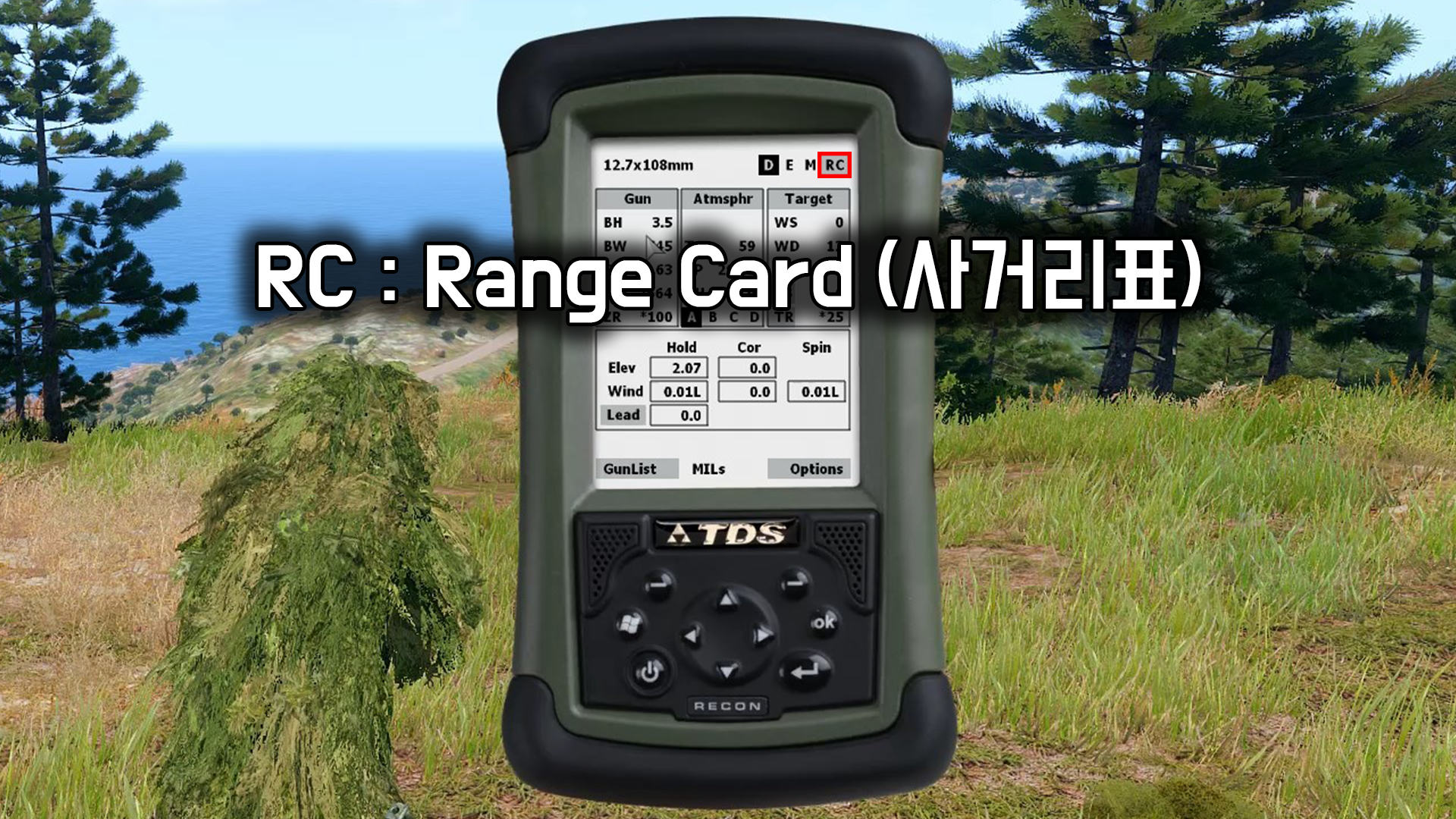 Range Card 상단에는 4가지 메뉴가 표시됩니다. 첫째 열인 Meters(혹은 Yards)는 목표와의 거리를 의미합니다. 둘째 열인 Elev은 탄낙차 계산을 위한 클리크의 상하 보정치를 의미합니다. 양수는 클리크를 상단으로 조절한다는 의미이고, 음수는 클리크를 하단으로 조절한다는 의미입니다. 셋째 열인 Wind는 코리올리효과 계산을 위한 클리크의 좌우 보정치를 의미합니다. 양수는 클리크를 우측으로 조절한다는 의미이고, 음수는 클리크를 좌측으로 조절한다는 의미입니다. 넷째 열인 TmFlt은 해당 거리까지 탄두가 비행하는 시간(Metric : 초, English : 초)을 의미합니다. 또한 TmFlt를 누르면 TmFlt - Lead - RemV - RemE 순으로 전환됩니다.