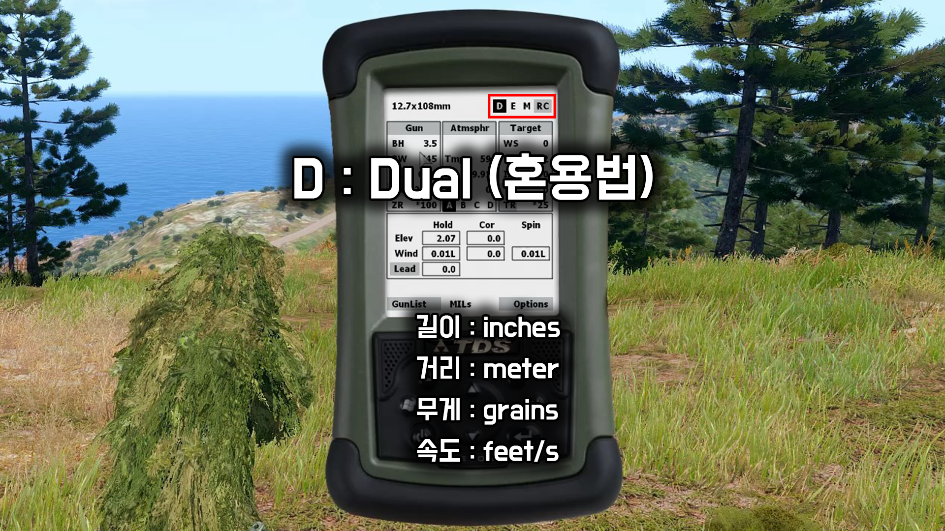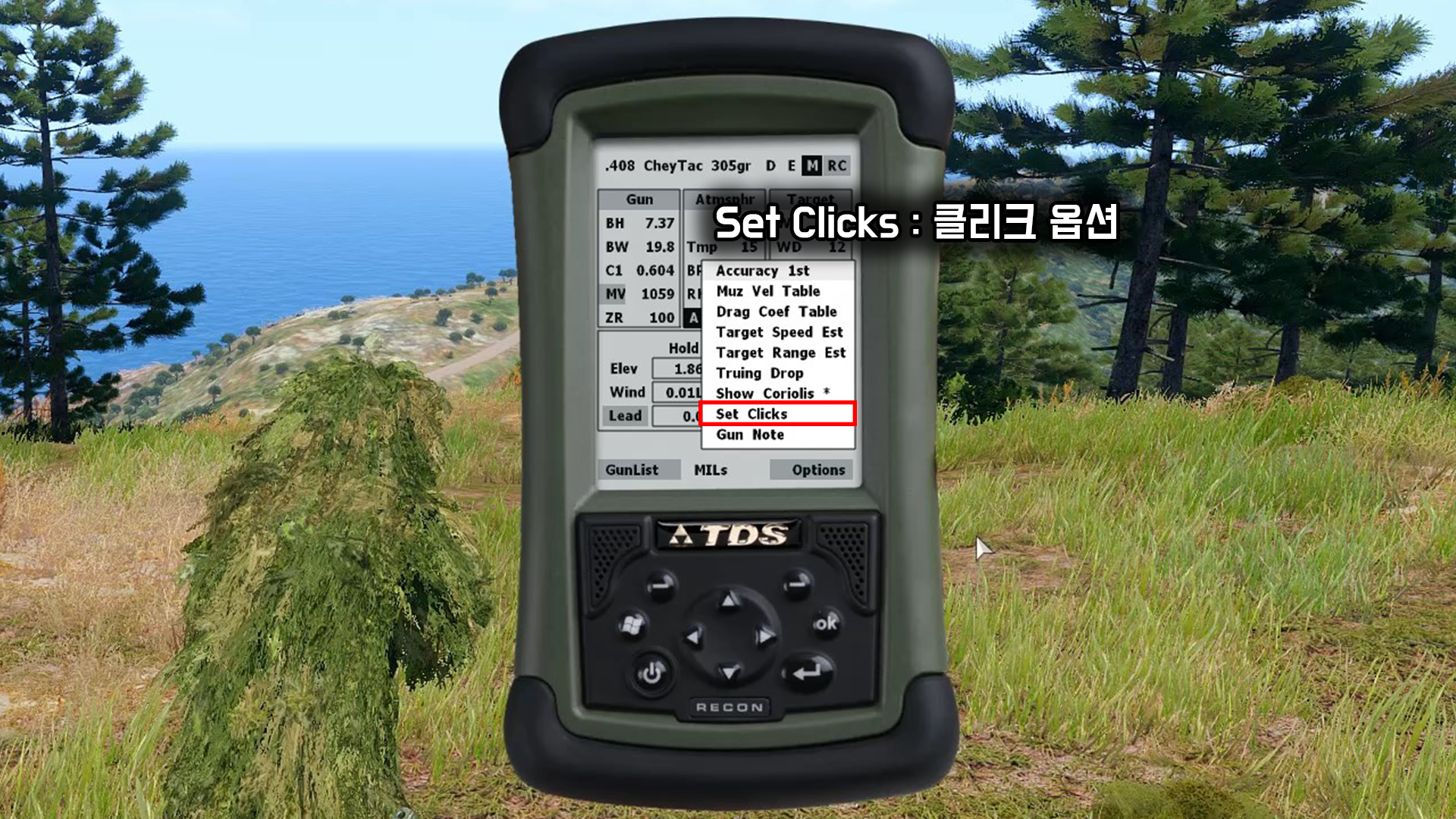 총기데이터와 환경데이터, 목표데이터가 모두 기입되면 목표물을 정확히 타격하기 위해 조절해야 하는 보정치가 산출됩니다. Hold 아래에 있는 3개의 값은 최종 보정치 입니다. Cor 아래에 있는 2개의 값은 코리올리효과를 반영한 보정치로 Hold값에 이미 포함되어 있는 값입니다. Spin 아래에 있는 1개의 값은 탄두의 회전에 따른 좌우 보정치로 Hold값에 이미 포함되어 있는 값입니다. Elev값은 상하 보정치로 양수는 클리크를 상단으로 조절한다는 의미이고, 음수는 클리크를 하단으로 조절한다는 의미입니다. Wind값은 좌우 보정치로 숫자 뒤에 R은 클리크를 우측으로 조절한다는 의미이고, 숫자 뒤에 L은 클리크를 좌측으로 조절한다는 의미입니다. Lead값은 목표물의 이동 등으로 발생하는 기타 보정치로 숫자 뒤에 R은 클리크를 우측으로 조절한다는 의미이고, 숫자 뒤에 L은 클리크를 좌측으로 조절한다는 의미입니다. Hold값에 포함되지 않았으므로 추가로 보정해 주어야 합니다. Lead를 누르면 Wind2로 변경할 수 있습니다. Wind2는 목표데이터에 입력한 풍속 최댓값의 경우의 좌우 보정치를 의미합니다. Wind 보정치와 별개의 보정치 입니다. MILs는 클리크 조절 단위입니다. MILs를 누르면 MILs - TMOA - SMOA - Clicks 순으로 순환합니다.