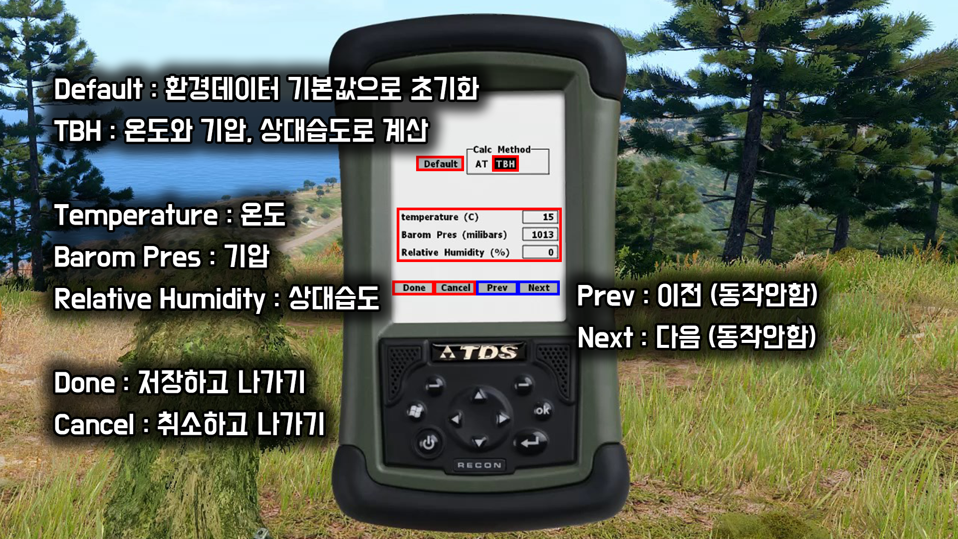 Default를 누르면 기본 저장값으로 복귀합니다. 환경데이터를 계산하는 방식은 두가지가 있는데 고도 (Altitude)와 온도 (Temperature)로 계산하는 AT 방식과 온도 (Temperature), 기압 (Barometric Pressure) 그리고 상대습도 (Relative Humidity)로 계산하는 TBH 방식입니다. TBH가 기본으로 설정되어 있으며 조금 더 정확합니다. Temperature는 온도를 의미합니다. Barom Pres는 기압을 의미합니다. Relative Humidity는 상대습도를 의미합니다. 모든 요소는 ACE 물품 중 Kestrel을 이용하여 측정할 수 있습니다. Done을 누르면 입력한 데이터를 저장하고 나갑니다. Cancel을 누르면 입력한 데이터를 저장하지 않고 나갑니다. Prev와 Next는 동작하지 않는 것으로 보입니다.