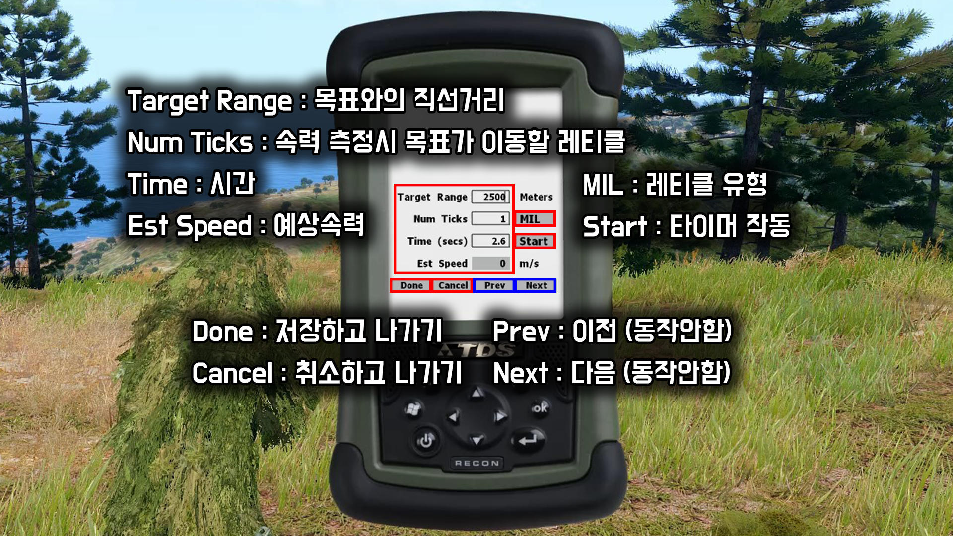 Target Range는 목표물과의 직선거리를 의미합니다. Num Ticks는 속력 측정시 목표가 이동할 레티클 수를 의미합니다. 예를들어 Num Ticks의 수가 3이라면, 목표가 3개의 레티클을 이동하는 동안 걸린 시간으로 속력을 계산합니다. Time은 목표가 이동하는 시간입니다. 직접 입력할 수 도 있고, 우측에 Start를 눌러 타이머를 사용해서 자동으로 측정할 수 도 있습니다. Est Speed는 위의 데이터들을 종합해 계산된 목표의 예상속력을 의미합니다. MIL은 스코프가 사용중인 레티클 유형을 의미합니다. 눌러서 MIL - TMOA - IOA 순으로 순환할 수 있습니다. Done을 누르면 입력한 데이터를 저장하고 나갑니다. Cancel을 누르면 입력한 데이터를 저장하지 않고 나갑니다. Prev와 Next는 동작하지 않는 것으로 보입니다.