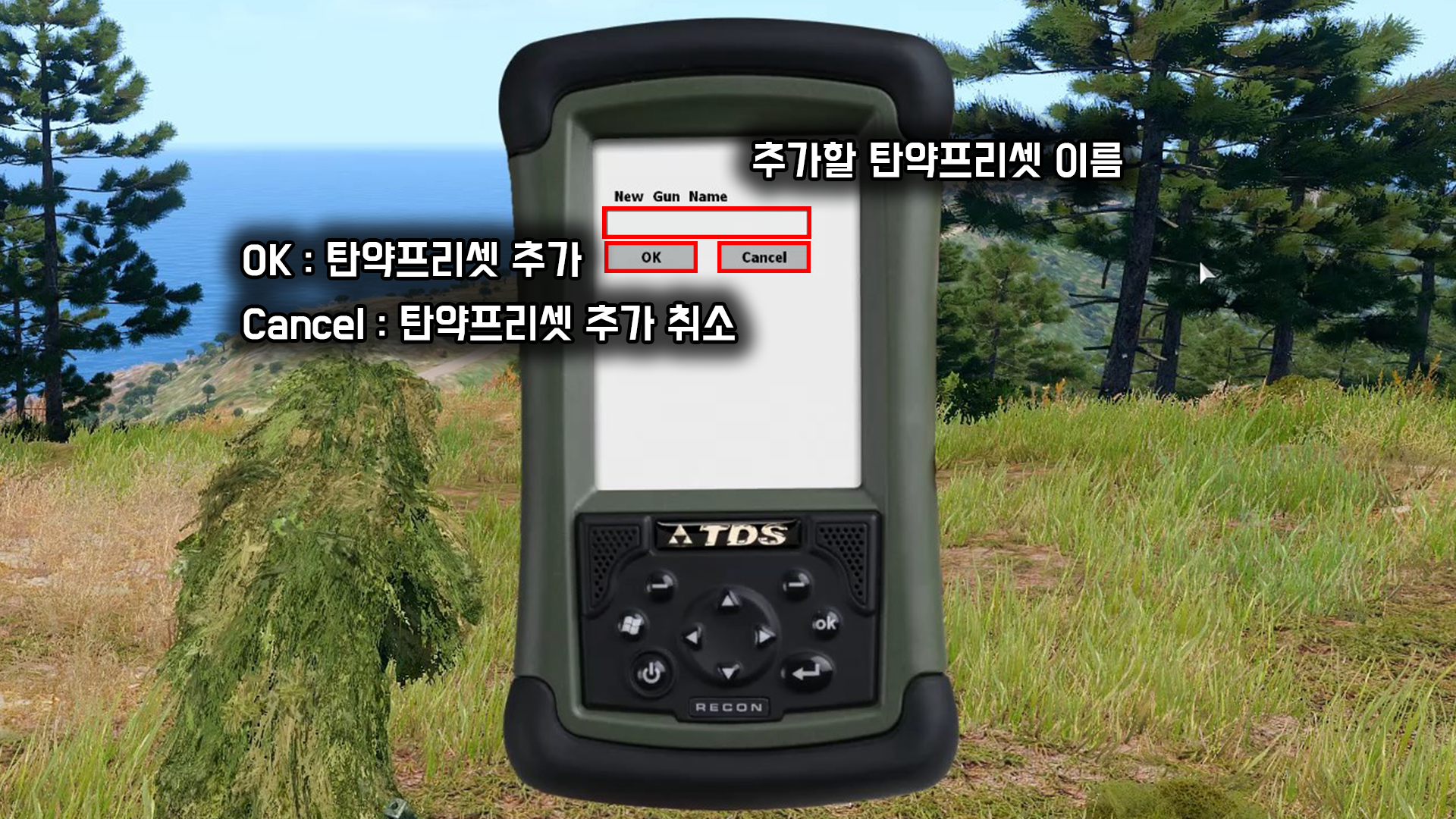 탄약프리셋 리스트에서 Add New Gun 을 누르면 현재 ATragMX에 기입된 데이터를 새로운 프리셋으로 저장할 수 있습니다. 빈 공간에 추가하기 원하는 프리셋 이름을 적은 후 OK를 눌러 프리셋을 추가하거나 Cancel을 눌러 프리셋 추가를 취소할 수 있습니다.