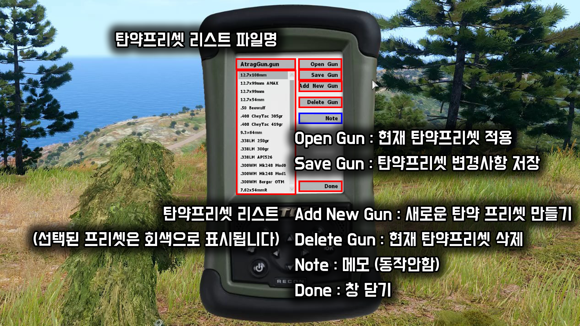 탄약프리셋 리스트 화면 좌상단에는 탄약프리셋 리스트 파일명이 표기됩니다. 그 아래에는 현재 탄약프리셋 리스트 파일에 포함된 탄약프리셋 리스트가 나와있고, 선택한 프리셋은 회색으로 표시됩니다. Open Gun 을 누르면 선택한 프리셋이 ATragMX에 적용됩니다. Save Gun 을 누르면 현재 ATragMX에 기입된 데이터가 선택한 프리셋에 저장됩니다. Add New Gun 을 누르면 현재 ATragMX에 기입된 데이터를 새로운 프리셋으로 저장할 수 있습니다. Delete Gun 을 누르면 선택한 프리셋을 삭제합니다. Note는 메모기능으로 보이지만 동작하지는 않는 것으로 보입니다. Done버튼을 눌러 창을 닫을 수 있습니다.