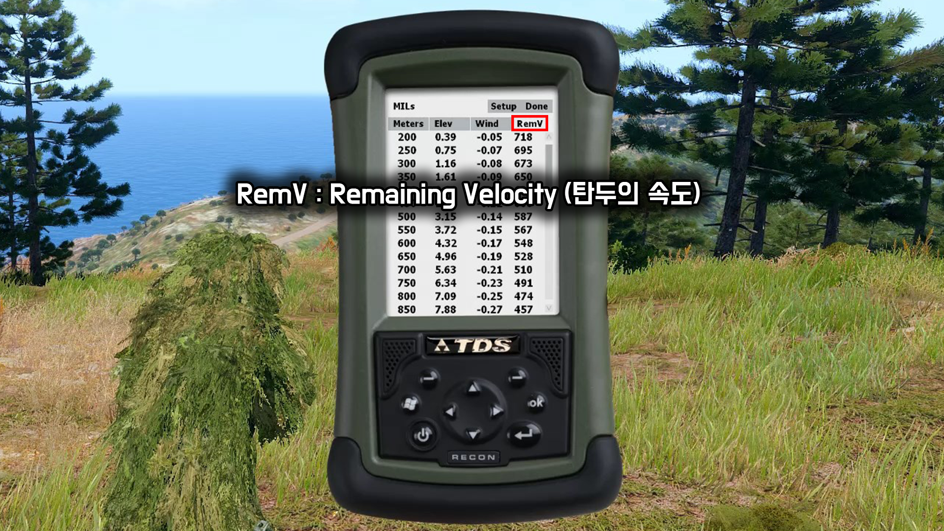 RemV는 해당 거리에서의 탄두의 속도(Metric : m/s, English : feet/s, Dual : feet/s)를 의미합니다. 탄두의 속도는 탄두의 비행시간, 탄낙차와 연관성이 있습니다. 또한 탄두의 속도가 아음속일 경우 거리 옆에 " * "표시가 생깁니다.
