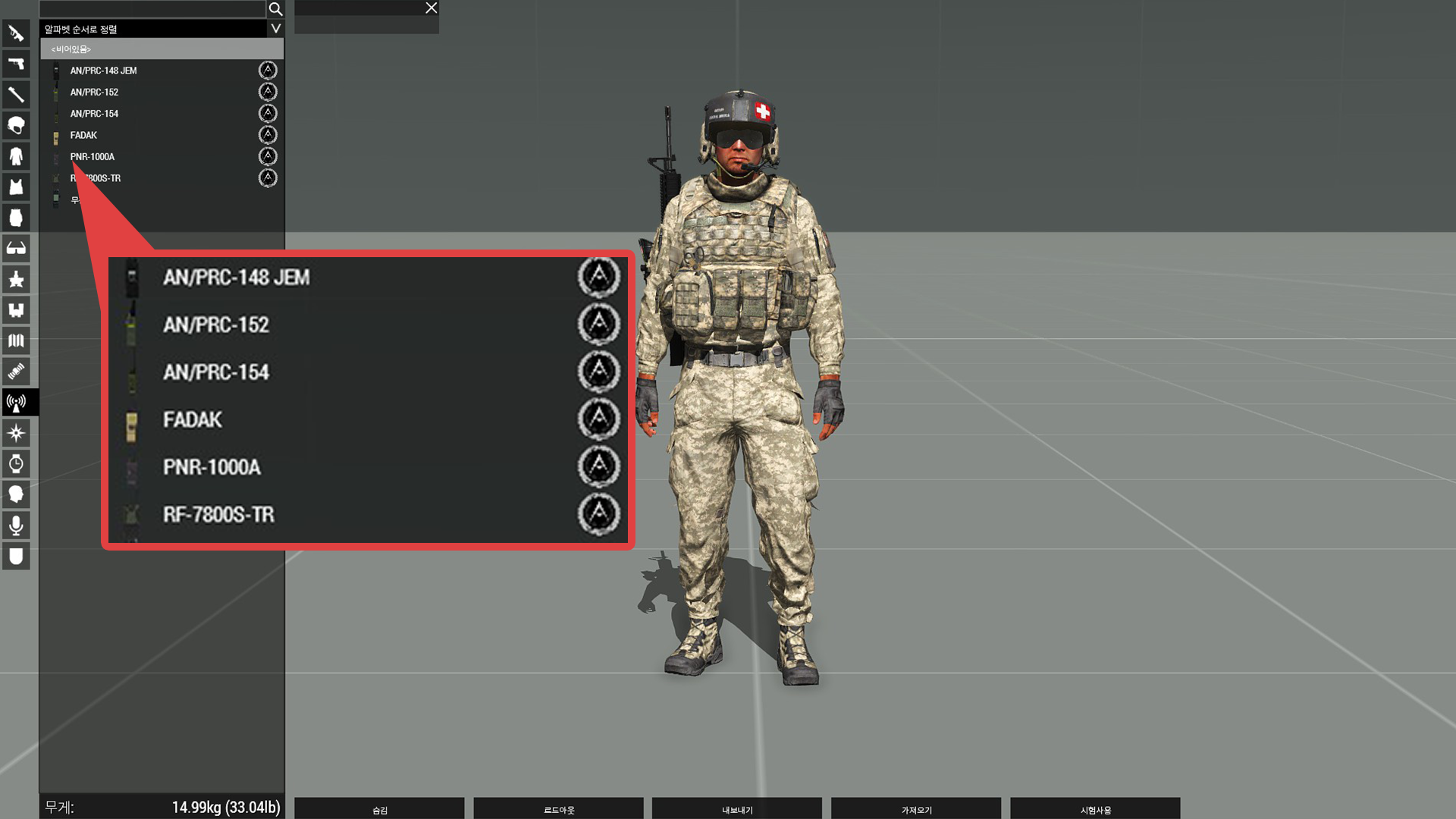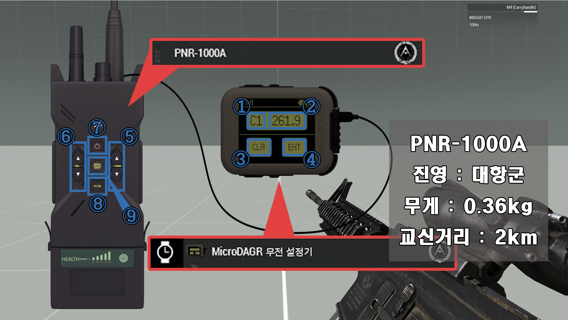 PNR-1000A는 대항군의 분대원용 단거리 무전기로 0.36kg의 무게에 2km까지 교신할 수 있습니다. 다른 무전기들과는 다르게 무전기 자체적으로는 주파수 변경을 할 수 없고 시계탭에 있는 "MicroDAGR 무전 설정기"를 가지고 있어야 주파수를 변경할 수 있습니다.