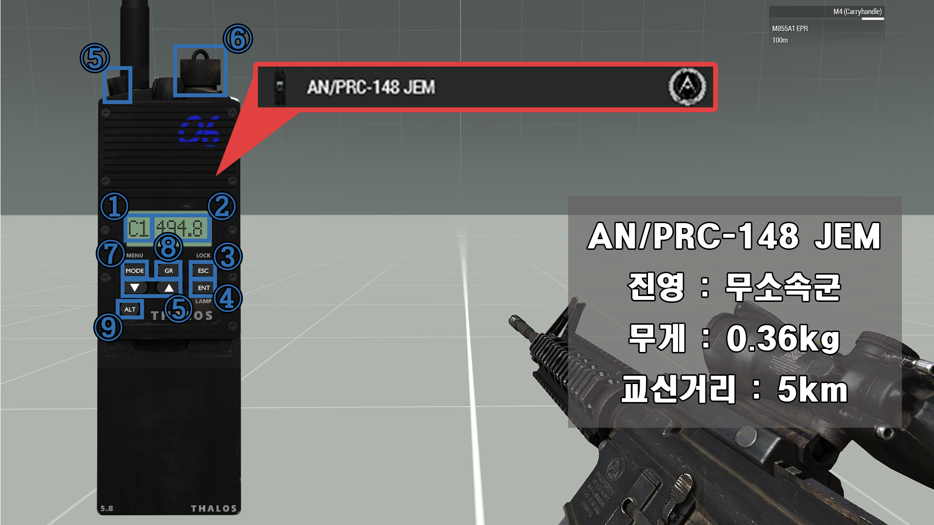 AN/PRC-148-JEM은 무소속군의 분대장용 단거리 무전기로 0.36kg의 무게에 5km까지 교신할 수 있습니다.