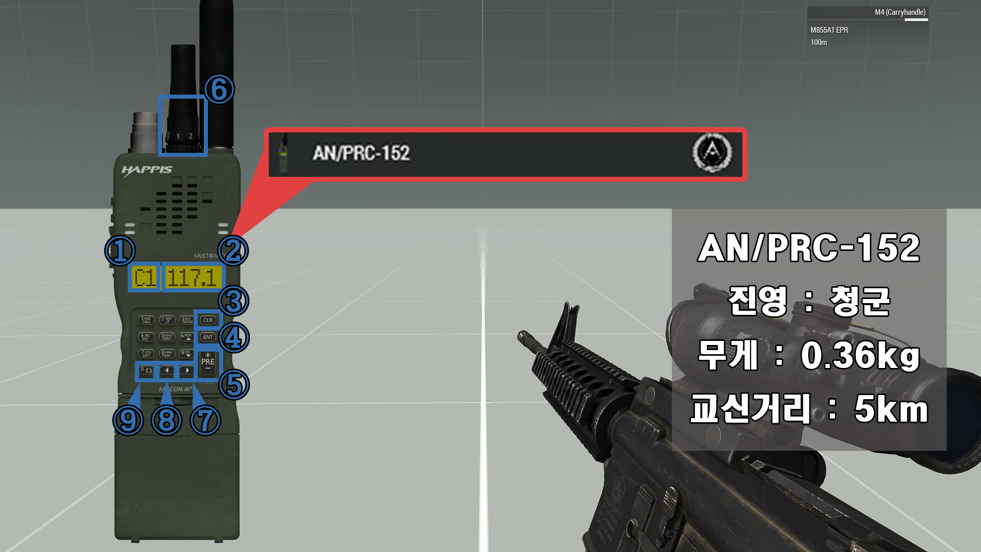 AN/PRC-152는 청군의 분대장용 단거리 무전기로 0.36kg의 무게에 5km까지 교신할 수 있습니다.