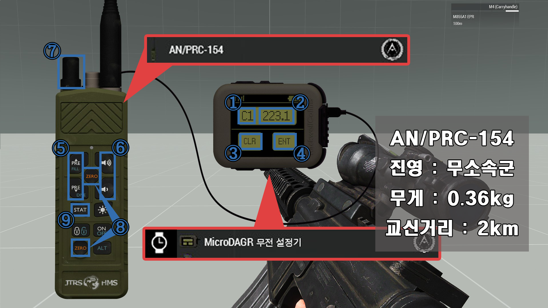 AN/PRC-154는 무소속군의 분대원용 단거리 무전기로 0.36kg의 무게에 2km까지 교신할 수 있습니다. 다른 무전기들과는 다르게 무전기 자체적으로는 주파수 변경을 할 수 없고 시계탭에 있는 "MicroDAGR 무전 설정기"를 가지고 있어야 주파수를 변경할 수 있습니다.