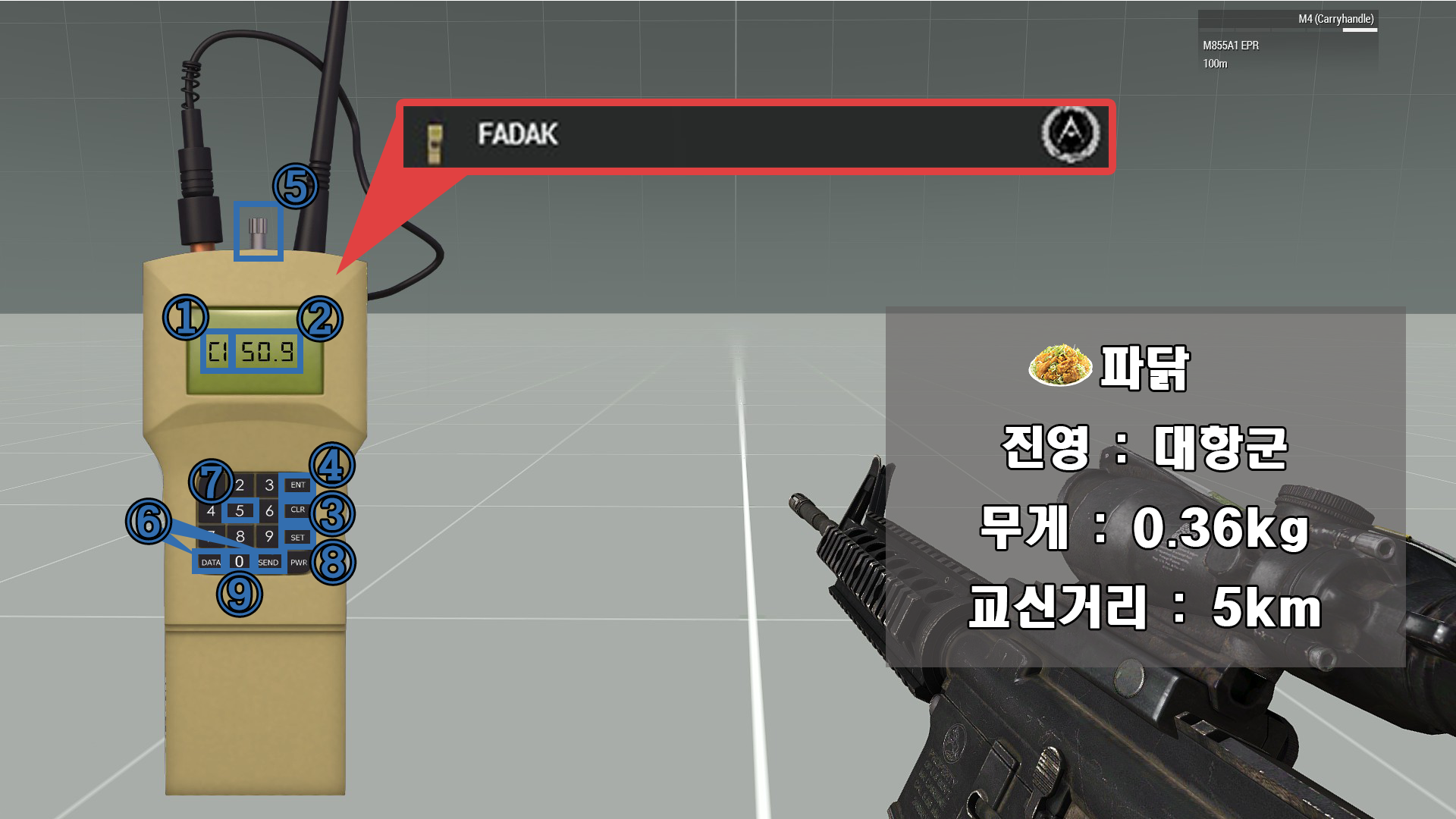 파닭은, 아니 FADAK은 대항군의 분대장용 단거리 무전기로 0.36kg의 무게에 5km까지 교신할 수 있습니다.