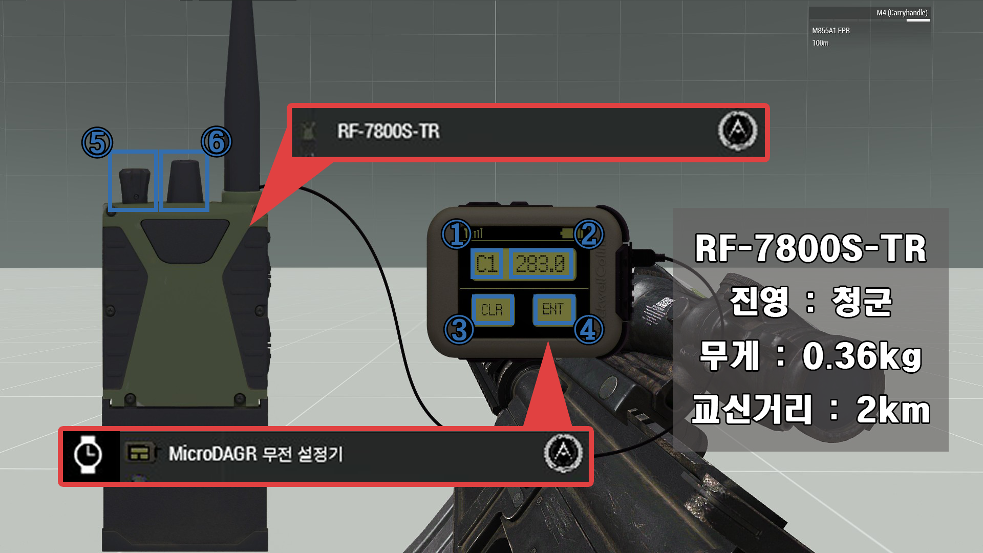 RF-7800S-TR은 청군의 분대원용 단거리 무전기로 0.36kg의 무게에 2km까지 교신할 수 있습니다. 다른 무전기들과는 다르게 무전기 자체적으로는 주파수 변경을 할 수 없고 시계탭에 있는 "MicroDAGR 무전 설정기"를 가지고 있어야 주파수를 변경할 수 있습니다.