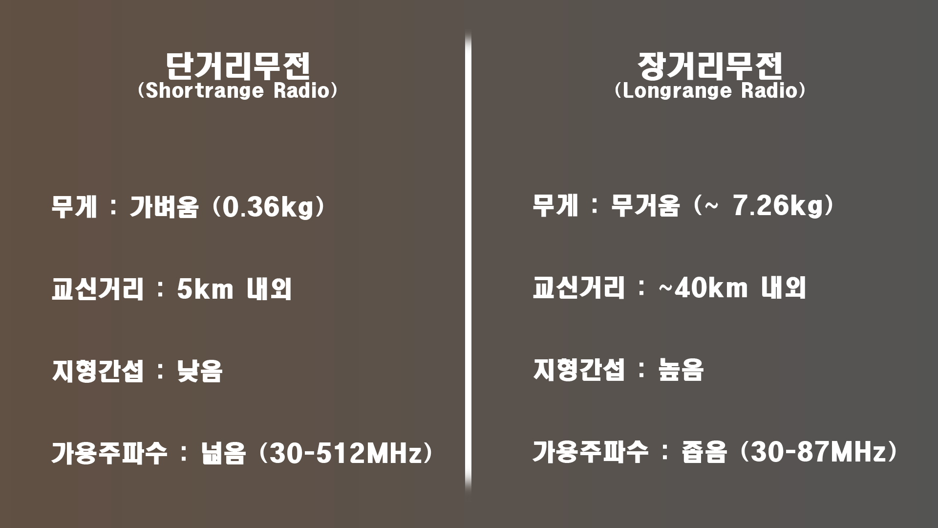 무전은 고유의 주파수가 있는데, 주파수가 높으면 직진성은 높아지나 회절에 의한 정보손실이 많아집니다. 따라서 음질이 또렷하고 지형에 의한 간섭이 적지만 장애물을 만나 회절하면서 정보손실이 많아 교신거리가 짧습니다. 반면 주파수가 낮아지면 직진성이 낮고 지형에 의한 간섭이 많지만 회절에 의한 정보손실이 적어집니다. 따라서 음질은 또렷하지 않지만 장애물을 만나 회절하여도 정보손실이 적어 교신거리가 깁니다. TFAR 애드온에서 이런 주파수의 특징을 구현해서 크게 단거리무전과 장거리무전으로 구분합니다. 단거리무전과 장거리 무전의 특징은 위의 사진과 같습니다.