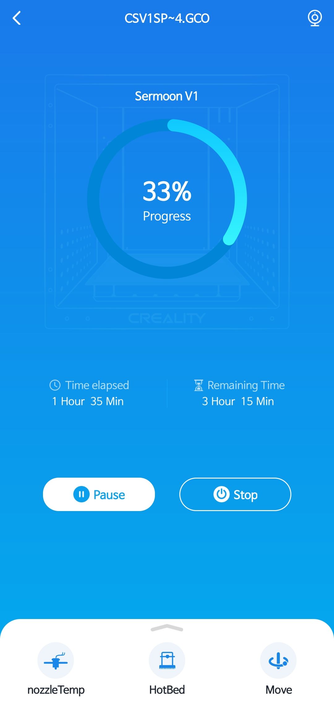 또 하나 장점이 와이파이 연결이 지원되서 어플을 통한 원격조작 및 모니터링이 가능하다는 점 입니다. 구매 할 때만 해도 원격으로 조작할 일이 뭐가있겠어 라는 생각을 했었는데요, 막상 원격 기능이 있으니 혹시 불이나지 않을까, 혹시 출력물이 늘러 붙어서 개판이 나있지 않을까 이런 걱정을 안해도 되서 좋은 것 같아요. 단순히 일시정지 기능만 지원하는게 아니라, 원격 인쇄 / 노즐 및 베드 온도 모니터링 / 온도 변경 / 진행과정 / 남은시간 등등도 확인할 수 있어 좋았습니다. 그리고 제품설명에 따르면 파일을 따로 안넣어도 어플을 통해 도면을 받고 인쇄까지 할 수 있다고 하더라구요! (저는 전송속도가 느린거같아서 이 기능은 쓰려다 중간에 포기했어요 ㅠㅠ)