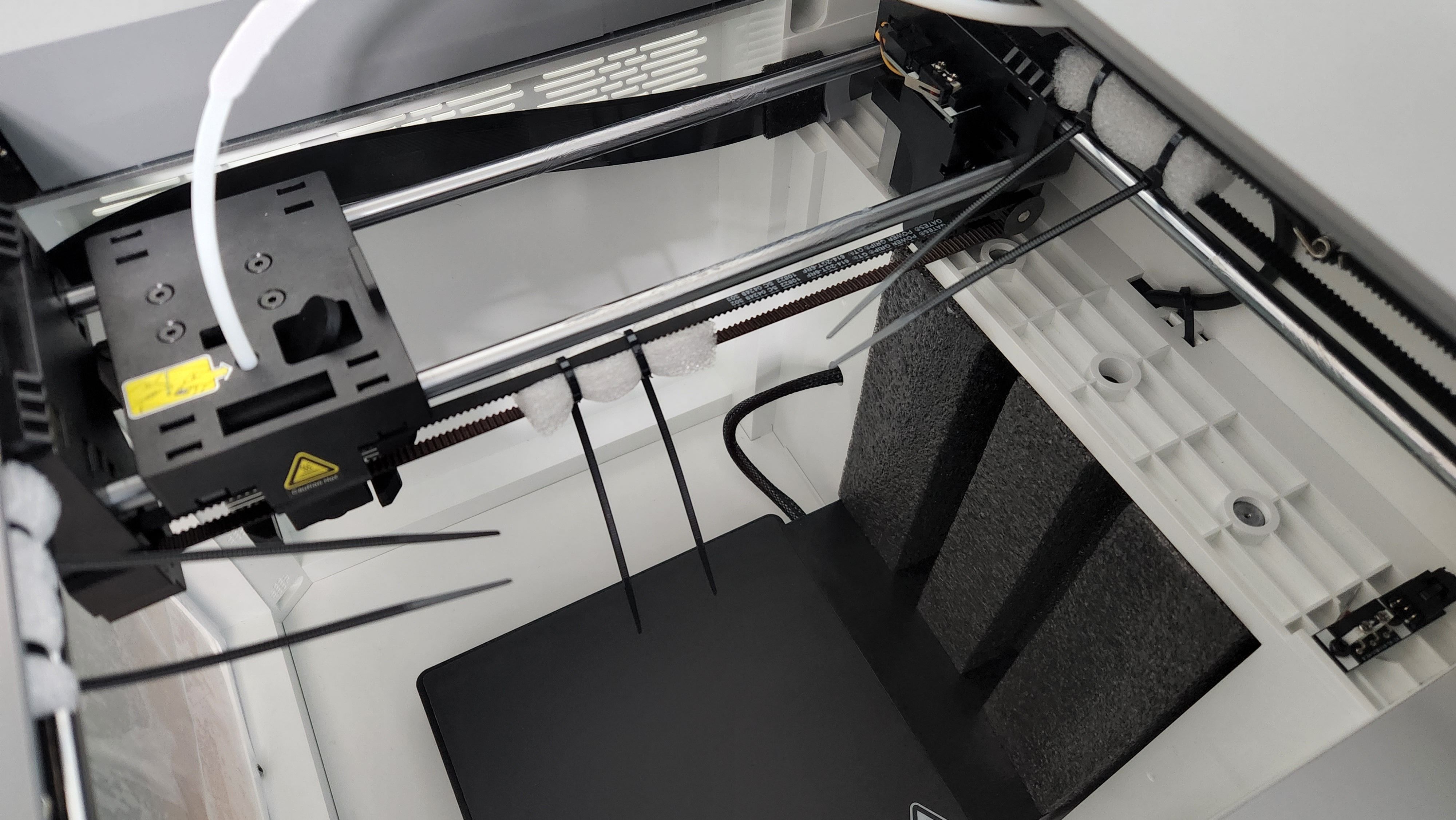 인쇄부가 배송과정에서 충격을 받지 않도록 케이블타이와 스펀지같은 걸로 잘 고정되어 있습니다. 동봉된 니퍼가 있으니 니퍼로 조심스럽게 케이블타이와 스펀지를 제거해 줍니다. 그럴 일은 없겠지만 축별로 있는 벨트를 실수로 끊으면 곤란하겠죠?