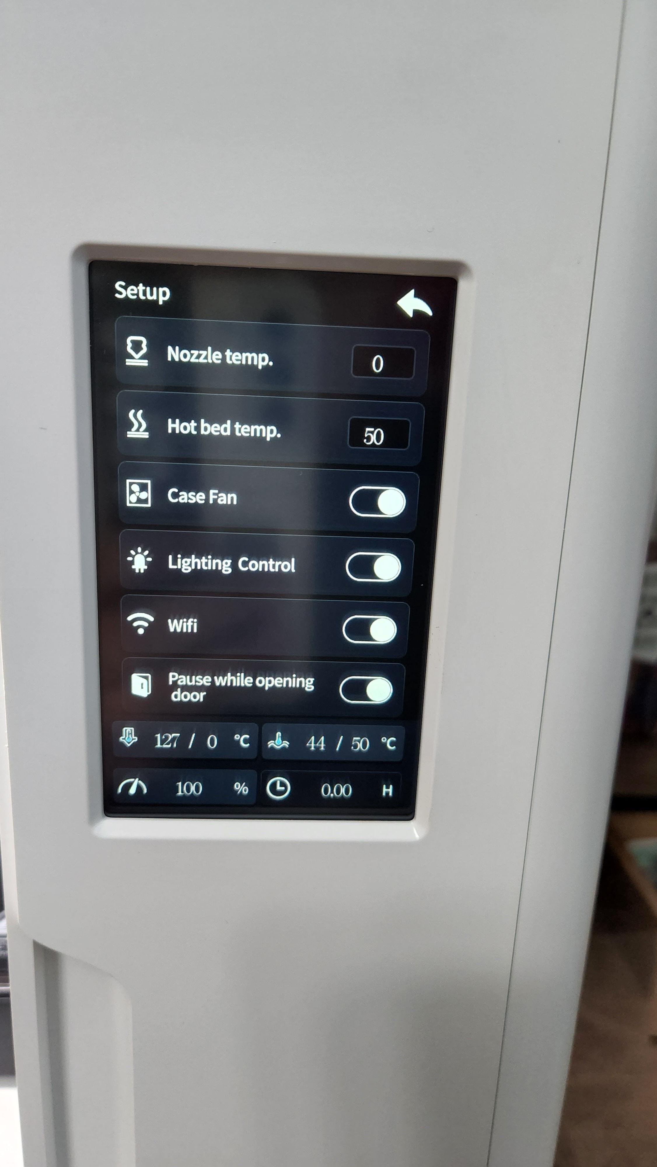 제품 우측에 접이식 필라멘트 거치대가 있습니다. 기기 내부에 필라멘트를 거치하는 제품도 봤었는데 외부에 거치하는게 혹시라도 모를 필라멘트 꼬임이라던가, 대용량 필라멘트 사용을 하는데 있어 더 편한 것 같아요. 그리고 챔버가 완전히 밀폐되서 유해한 물질들이 안에 있길 바랬는데 챔버자체에도 통풍구가 있고, 인쇄시 자동으로 배기가 작동되기 때문에 꼭 환기가 잘 되는 공간에서 사용하시길 바래요. 예전에 조립식 Anet A8을 사용했었는데 그때는 잘 안눌리는 버튼을 일일히 눌러주느라 손도 아프고 인쇄할땐 흔들릴까봐 누르지도 못했는데요, V1제품군은 기본적으로 4.3" 터치스크린으로 제품을 조작하고 터치감도 무척 좋기 때문에 조작이 너무나도 간편했습니다. UI도 심플하고 직관적으로 되어 있어 한글지원은 안되지만 쓰는데 큰 무리는 없을 듯 해요.