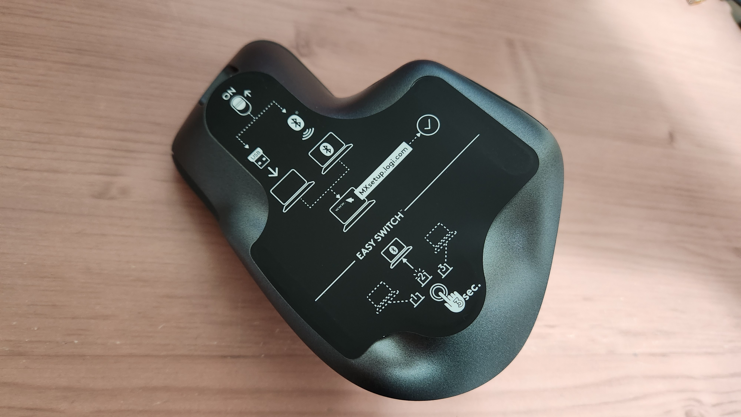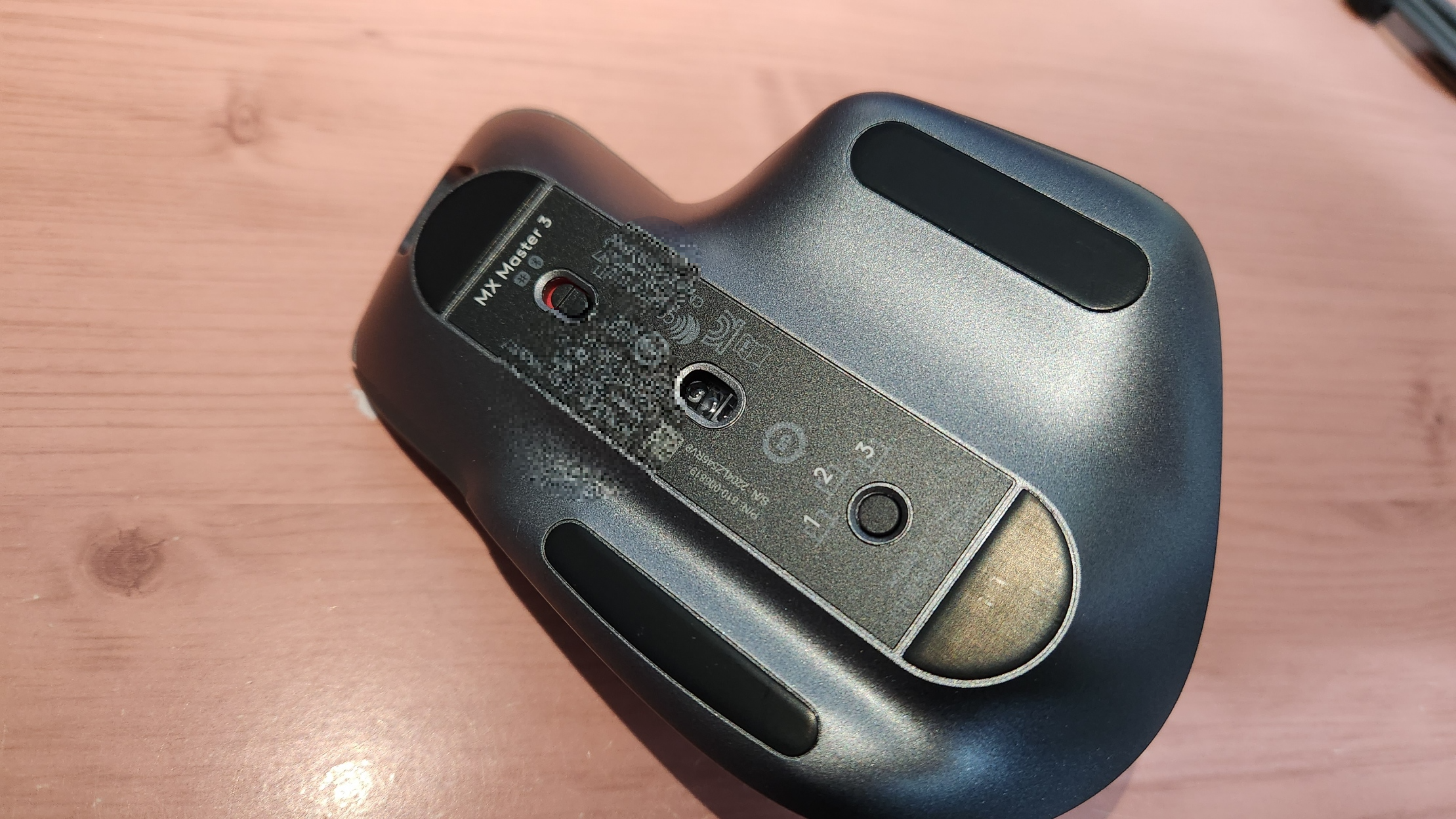 처음에는 바닥에 센서가 없는건줄 알았지만 저 스티커를 떼어내야 전원 스위치와 연결설정을 할 수 있습니다. MX Master 3는 최대 3대의 디바이스에 연결할 수 있고, 하단에 Easy-Switch 버튼을 눌러 빠르게 디바이스 전환을 할 수 있습니다. 또한 현재 활성화된 디바이스 번호에 불이 들어오기 때문에 어떤 디바이스에 연결되었는지 헷갈릴 일도 없습니다.