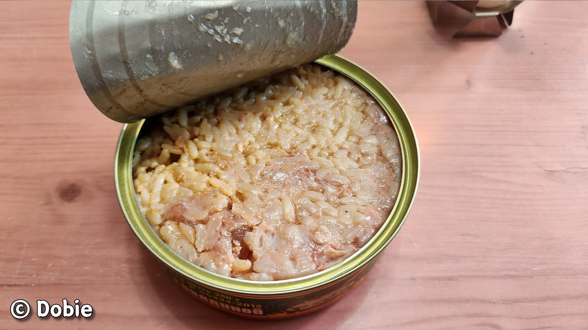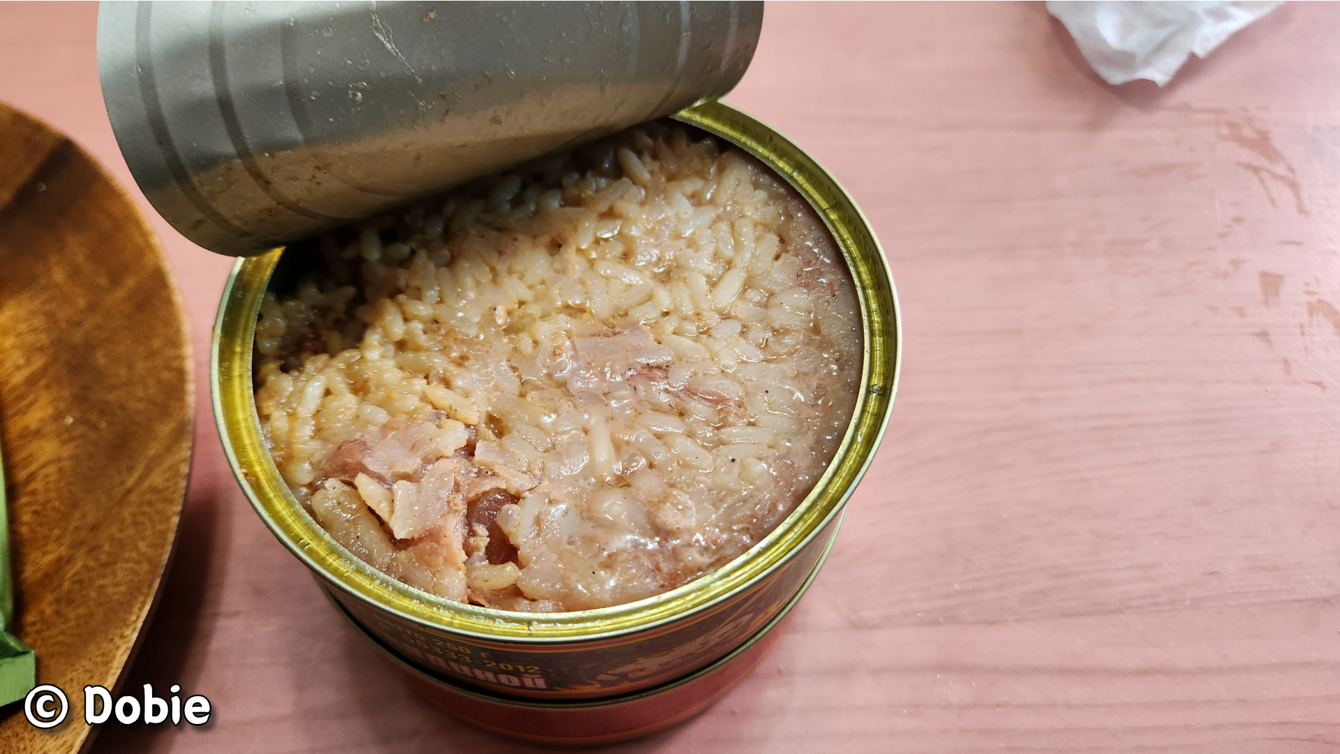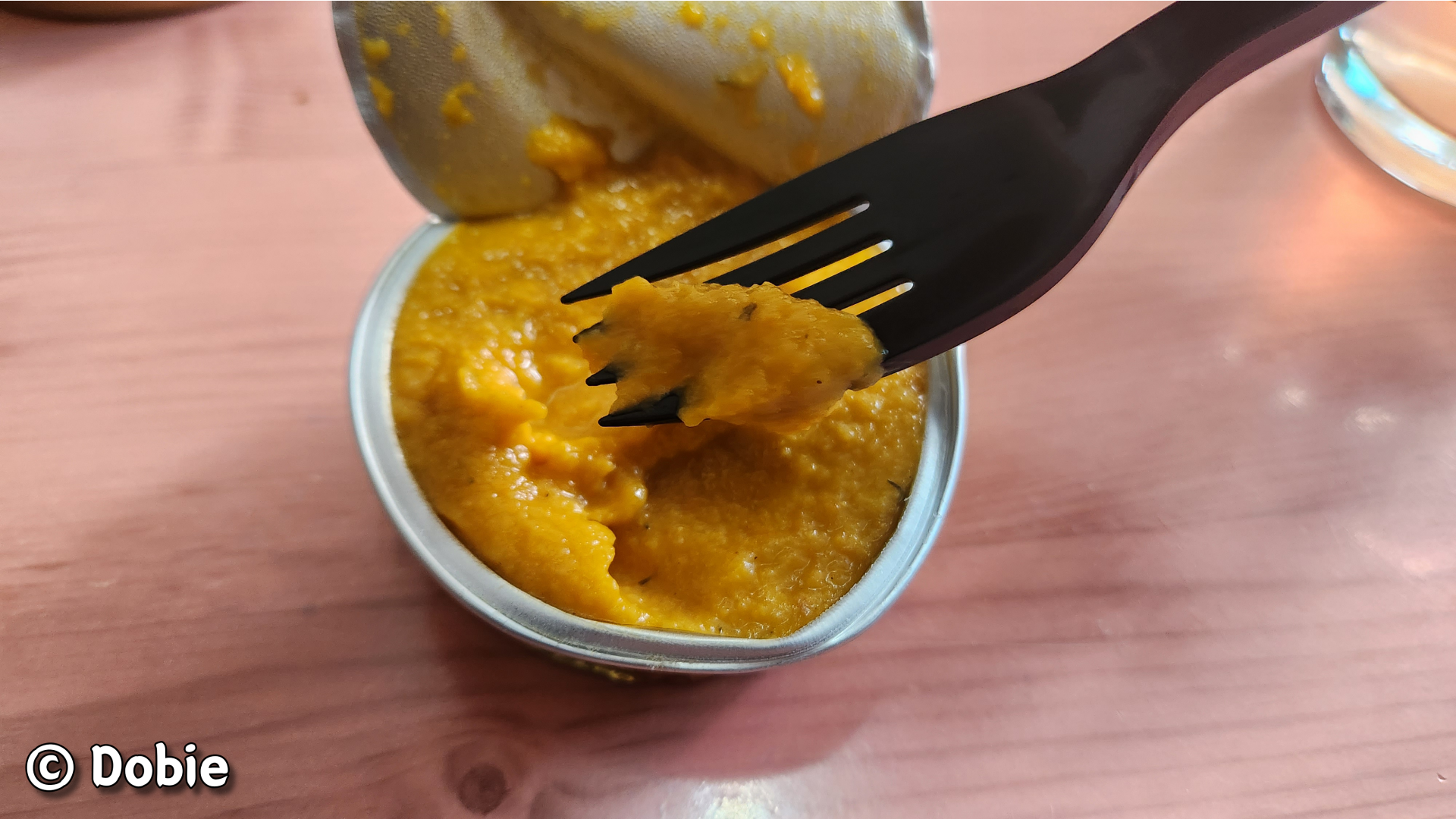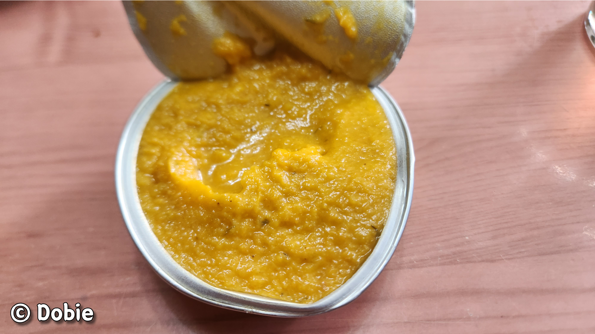 고체연료로 가열을 해봤는데 화력이 너무 세다 보니 캔과 접촉한 부분은 타고 가운데만 먹을 만했습니다. 하지만 너무 음식이 말라 있어 촉촉한 식감은 찾아보기 어려웠습니다. 소고기죽에는 당근으로 보이는 야채와 소고기 조각들이 들어있었는데 야채는 너무 푹 익어버린 식감이었고, 소고기는 마른 장조림같이 다소 딱딱한 식감이었습니다. 전체적인 간은 짠 편이고 칼로리 때문인지 매우 느끼했습니다. 전체적인 맛은 국군의 즉각취식형 전투식량 1식단 "쇠고기볶음밥"과 비슷한 편이지만 특유의 알 수 없는 향신료와 느끼한 기름 맛 때문에 맛있게 먹지는 못했습니다.