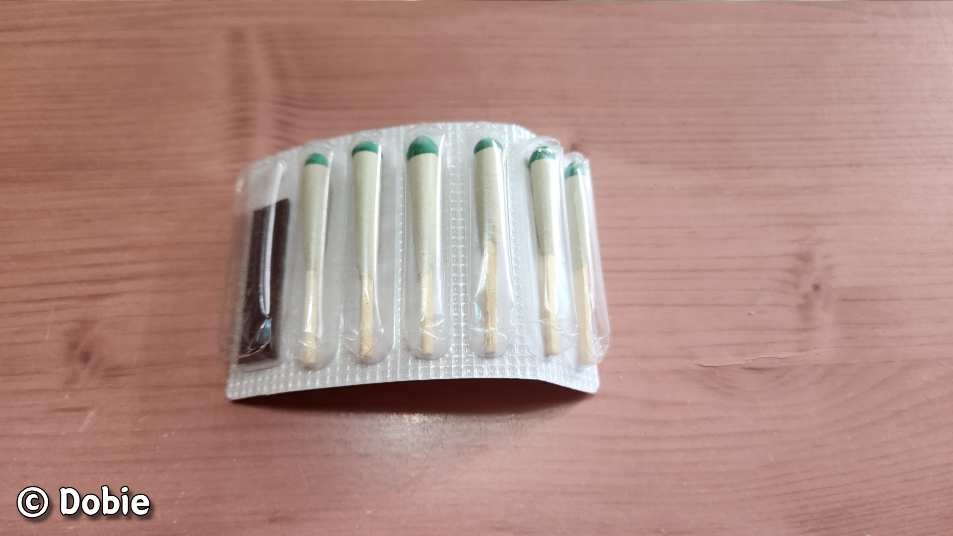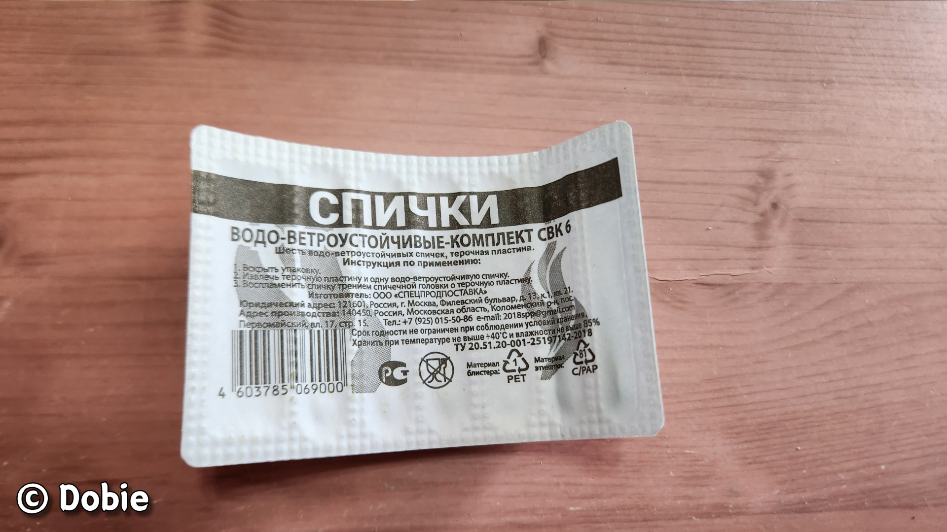 방수 및 방풍 성냥인데 6개비가 모두 개별포장되어 있고, 사이즈가 꽤 큽니다. 그리고 일반적인 성냥과 다르게 인이 도포된 부분의 면적이 매우 넓으며 색도 빨간색이 아닌 초록색인 점이 흥미롭습니다.