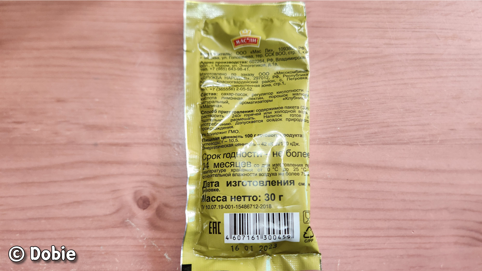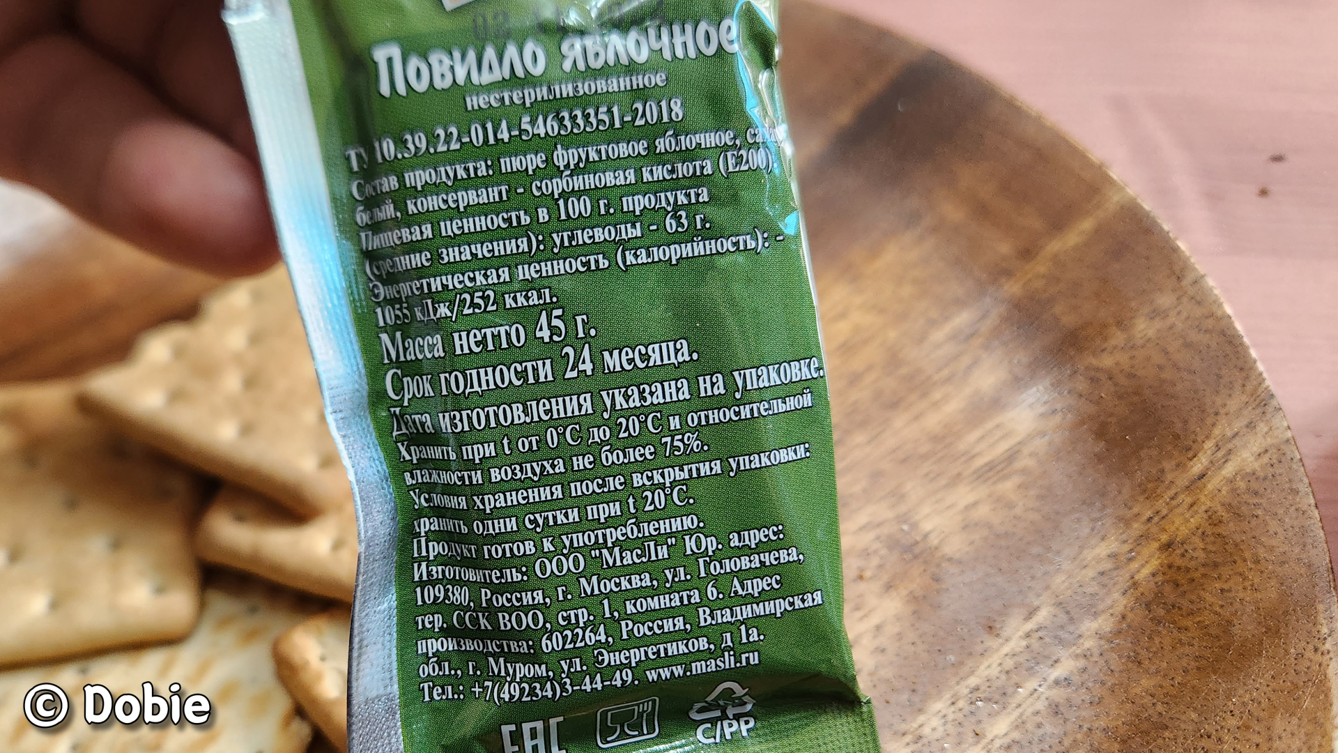 우선 질긴 비닐 외부 포장을 통해 이물질로부터의 오염을 방지하고 있습니다. 외부에는 메뉴 구성과 영양 성분표가 러시아어로 적혀 있으며, 한 끼가 아닌 하루치 식사가 모두 포함되어 있다는 점이 특이했습니다. 유통기한은 24년 1월 8일까지로 보입니다.