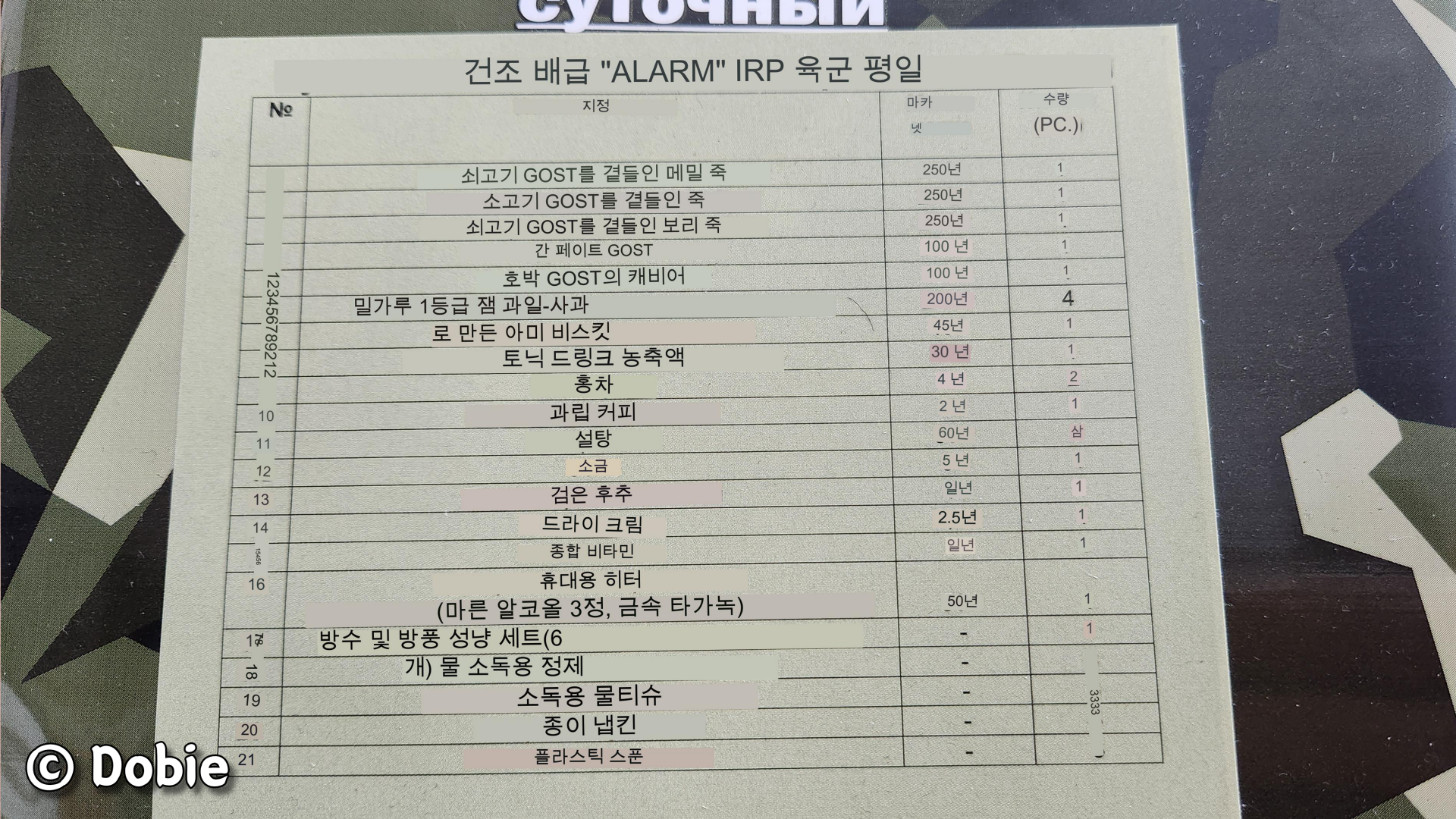 우선 리뷰에 앞서, 제가 구매한 제품이 군용인지 혹은 군용 전투식량과 같은 구성을 한 민수용인지 정확히 확인할 수가 없었습니다. 하지만 여러 정보를 취합하여 비교해 보니 러시아 육군의 전투식량과 그 구성은 동일하였습니다. 따라서 군용이라는 가정하에 리뷰를 진행해 보겠습니다.