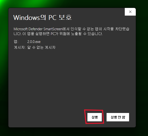 다운받은 통합설치기는 소프트웨어 코드서명이 되어있지 않아 위 사진과 같은 스마트스크린 보호화면이 뜹니다. 추가정보를 누른 후 실행을 누르면 정상적으로 실행할 수 있습니다.