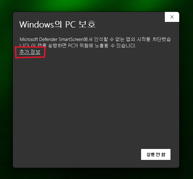 다운받은 통합설치기는 소프트웨어 코드서명이 되어있지 않아 위 사진과 같은 스마트스크린 보호화면이 뜹니다. 추가정보를 누른 후 실행을 누르면 정상적으로 실행할 수 있습니다.