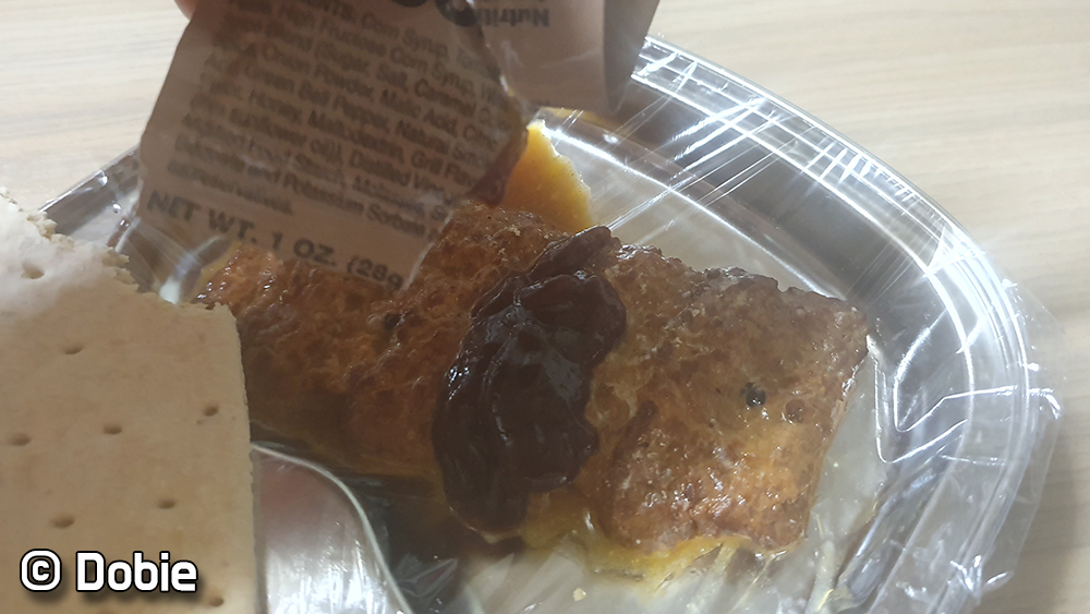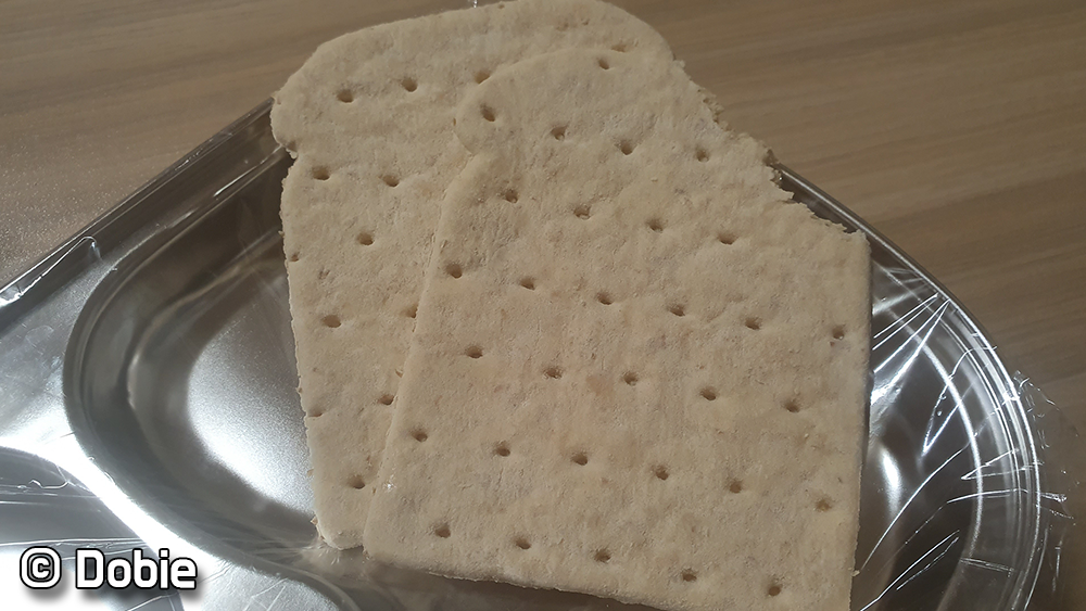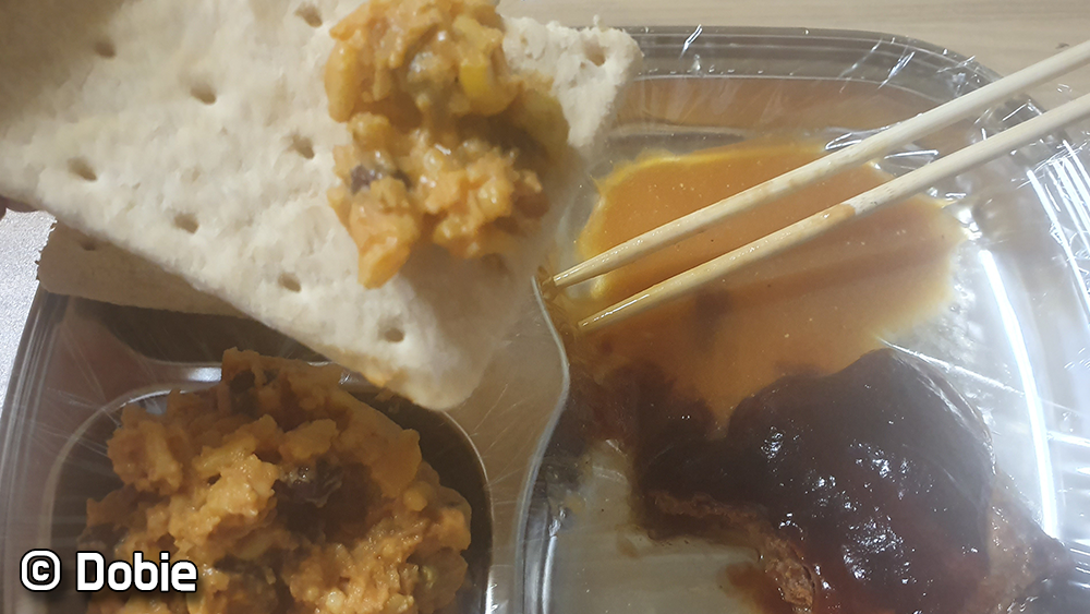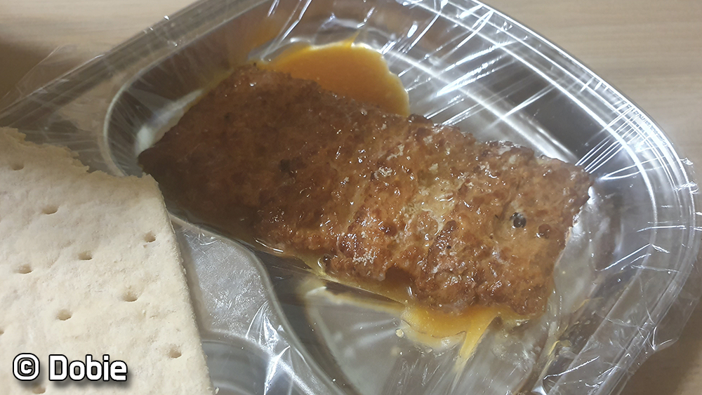개인적으로 이번메뉴는 주식 부식 모두 아쉬웠습니다. 게다가 쌀과 콩을 섞어놓은 주식은 암내(?)같은 냄새가 났습니다... 이게 유통상에 문제가 있어 변질되서 난 냄새인지 음식 자체의 냄새인지 알 수 없지만 도저히 먹을 수 없었습니다. 돼지고기 패티도 식감이 편의점에서 파는 핫바보다 한참 못했고 맛도 그냥 그랬습니다. 다만 레인저바가 맛있어서 다행이라는 생각이 들었습니다.