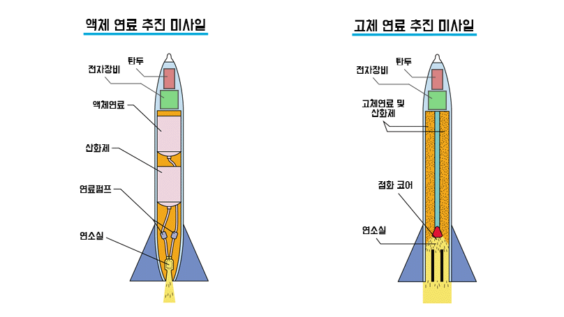 액체연료로 추진하는 미사일(LRE : Liquid-propellant Rocket Engine)은 액체 연료와, 이를 연소시키는데 필요한 액체 산화제가 각각 다른 탱크에 적재되어 있습니다. 연료는 연료 펌프에 의해 작은 연소실로 분사되고 연소실 내부의 점화기에 의해 연소됩니다. 연소되면서 생긴 화염과 가스는 노즐을 통해 미사일의 역진행방향으로 분사되고 반작용으로 미사일은 진행방향으로 나아갑니다. 액체 연료로는 주로 케로신 (Kerosine : 등유)를 많이 사용합니다.