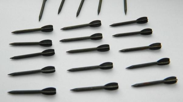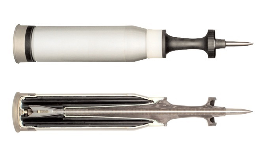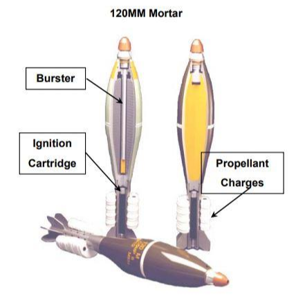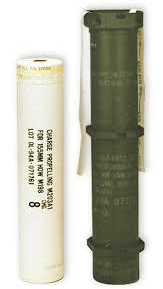 위의 두 경우와 다른 별개의 포탄도 있는데요 바로 신형 박격포탄입니다. 비교적 최근에 나온 박격포탄은 아래 사진처럼 포탄 후미에 추진장약을 따로 장착합니다. 이 추진장약의 양에 따라 포탄의 사거리가 바뀌게 됩니다. 하지만 신관이 바로 추진 장약을 점화시키지는 않습니다. 박격포탄이 포신을 따라 낙하하면 포신 최하단부에 공이와 부딪히게 됩니다. 이때 공이는 점화기를 연소시키고, 점화기는 추진장약을 연소시켜 이 때 발생한 가스의 압력으로 박격포탄이 발사되게 됩니다.
