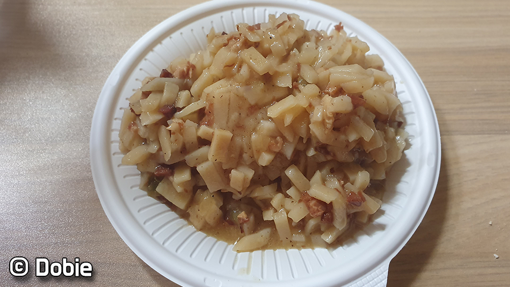 주식도 주식이지만 부식은 정말 최고라는 수식어가 부족할 정도로 대단했습니다! 아침으로 20번 메뉴의 부식과 음료만 먹는다면 저는 일주일 내내 먹어도 질리지 않을 것 같아요! 물론 주식도 다른 메뉴에 비해 꽤 맛있는 편이었습니다. 감자의 씹는 식감도 살아있고 베이컨과 양파, 후추가 적당히 곁들여져 약간 짠 것을 제외하면 한국인 입맛에도 맛는 메뉴였기 때문입니다. 하지만 이번 메뉴의 주역은 누가 뭐래도 부식이었던 것 같네요.