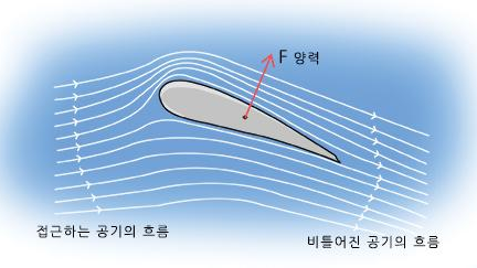 또한 날개 상하단부의 공기의 흐름에도 주목하여야 하는데요, 모든 날개의 단면은 평면이 아닌 상하가 비대칭적인 곡률을 가집니다. 이러한 곡률은 날개 상하단부의 공기의 속도를 다르게 변화시키는데요, 날개의 상단부는 공기의 속도가 상대적으로 낮아지도록 설계된 반면 날개의 하단부는 공기의 속도에 큰 영향을 주지 않도록 설계되어 있습니다. 때문에 공기의 속도가 낮아진 날개 상단부의 압력이 낮아지게 되며 상대적으로 공기의 압력이 높은 아래쪽에서 공기의 압력이 낮은 위쪽으로 힘이 발생합니다. 이것이 양력의 대부분을 차지하는 힘입니다.
