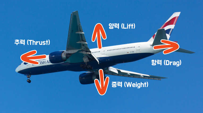 비행기에 작용하는 4가지 힘은 중력 / 양력 / 추력 / 항력 입니다. 먼저 중력은 익히 알고 있는 힘인데요, 모든 물체는 고유의 질량이 있고, 질량에 따라 받는 중력의 크기도 다릅니다. 물체에 작용하는 중력의 크기가 크면 우리는 이를 "무겁다"라고 표현을 하죠. 비행기의 경우 작은 여객기의 경우 중량이 10~20t가량 되는 반면 대형 여객기인 경우는 40~60t에 육박합니다. 그럼 이렇게 무거운 중력을 거스르면서 비행기를 하늘에 띄우는 힘은 무었일까요?